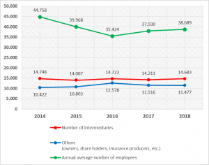 There was a big decline in the number of employees between 2014 and 2016. Even though the number of employees in the period of 2016 – 2018 was rising again but it was still below 2014 and 2015. During this period number of intermediaries remained almost the same while the number of other related people (owners, share holders, salespeople, etc.) increased by 10%.