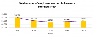 The cost of 10,000 TRY premium production to intermediaries seems to decreased 17.3% between 2014 and 2018, but the cost rising have been prominently felt since 2016. Let’s continue to examine the changes of the costs, premiums and number of employees in agencies and brokers.